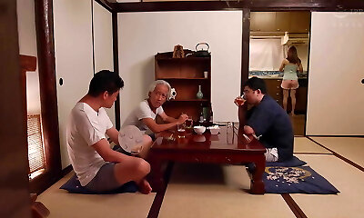 Sexy Busty Asian Ladies Take Turns Sucking Cock While the Old Men Watch 3