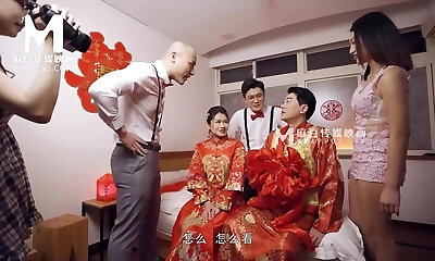 Busty Chinese Beauty Gets Banged by Two Men in Her Wedding Room MD-0232